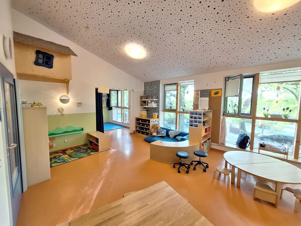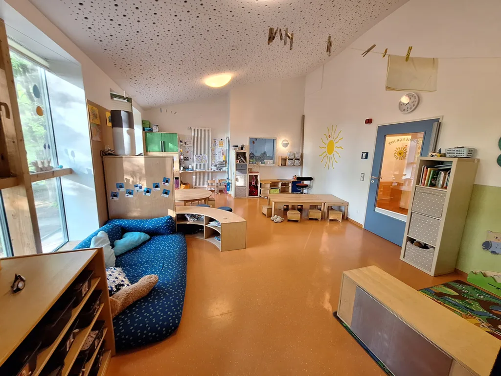 Die Sonnengruppe ist eine inklusive Krippengruppe, in der bis zu 14 Kindern im Alter von 8 Monaten bis 3 Jahren von drei Kolleg:innen betreut werden. Der helle Gruppenraum, der durch seine großen Fenster zum Vorgarten viel Gelegenheit für schöne Abschiede am Morgen und freudiges Wiedersehen am Nachmittag gibt, lädt durch seine besondere Hochebene zum Spielen, Verstecken und Kuscheln ein.